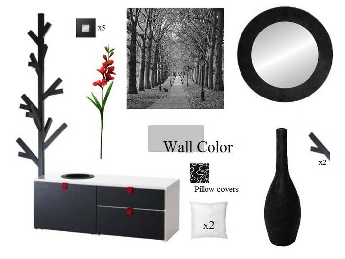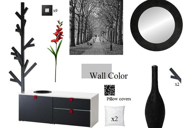 I mounted an Ikea Billdal Mirror on the wall across from the unit and placed an Ikea FÖRÄNDRAD Vase, that I spray painyed black, with a smycka Gladiolus flower in it under the mirror. On the storage bench I placed 2 cushions (2 inner cushions covered in Ikea Nils Eslöv Black/White pattern )