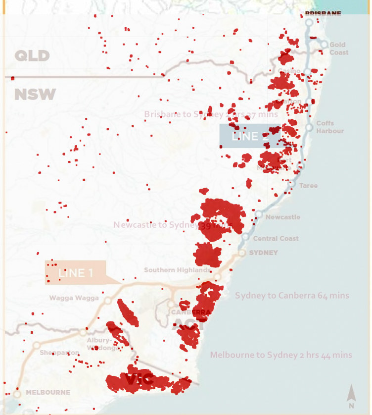 A BuzzFeed News comparison of the federal government's proposed high-speed rail route and areas affected by bushfires during December 2019 show that there is almost no overlap between the two areas.