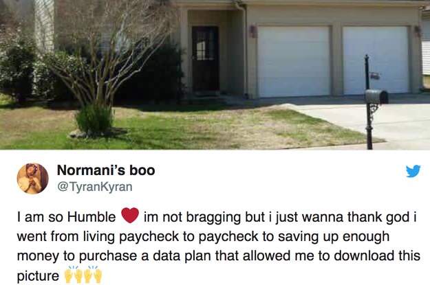 I am so Humble ❤ im not bragging but i just wanna thank god i went from living paycheck to paycheck to saving up enough money to purchase a data plan that allowed me to download this picture 🙌🙌 https://t.co/ZdS1Yjasb5