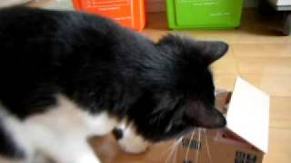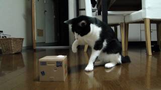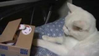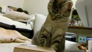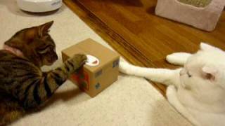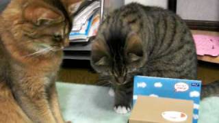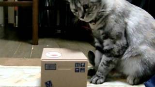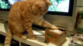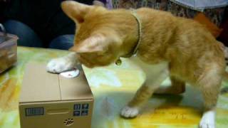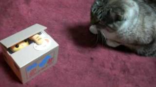 What, you ask, is a "cat bank"? It's a piggy bank shaped like a cardboard box with a motorized kitten inside it. These few cats are brave enough to protect us from those diabolical creations.