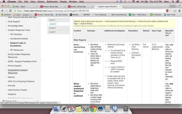 In another customer service screenshot pertaining to confirmed driver alcohol/drug use, support logic instructions suggest that “if rider does not want to escalate with LE (law enforcement) or media, follow strike system, issue warning, and resolve without escalating.”