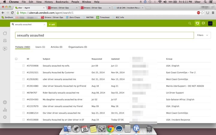 The screenshots obtained by BuzzFeed News show at least nine complaint tickets with the subject line of “sexual assault” and at least nine results out of 382 with subjects for “sexually assaulted,” including “uber driver sexually assaulted me,” “sexually assaulted by Uber driver in SF,” “Uber driver sexually assaulted my girlfriend,” and “my daughter sexually assaulted by drive.”