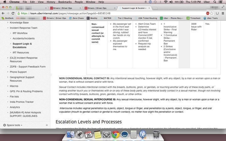 Screenshots from Uber’s “Support Logic and Escalations” section inside Zendesk also show that customer service reps handling nonconsensual sexual contact cases should take media and law enforcement interest into account when deciding to escalate cases to higher-ranking employees. “Determine LE/media interest and have Comms/LERT monitor if risk confirmed,” one screenshot reads.