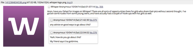 Following Apple’s tighter iCloud security, users of AnonIB’s /stol message board, where anonymous users trade phishing secrets, take requests, and advertise their particular ripping skills, are now targeting the anonymous sharing app, Whisper. A /stol post from this past Saturday suggests that AnonIB users are posing as owners of escort services to entice women (many of whom they claim to be under age) to share nude pictures. “Anon, have you fished for images on Whisper? There are all sorts of opportunities there for girls who share their pics without second thought. I’ve gotten some nudes from some young teens, and have actually had a couple of hook-ups with hot girls as well,” it reads.