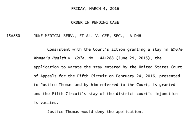 On Friday, neither Chief Justice John Roberts nor Justice Samuel Alito voiced objection to the move in the Louisiana case. Both had done so this past June in the Texas case. The fourth justice who had objected in the Texas case was Justice Antonin Scalia, who died last month.