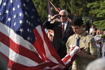 Governor Tom Corbett salutes as a Boy Scout raises the American flag while the National Anthem is played on Monday, May 26, 2014. Nabil K. Mark/Centre Daily Times / MCT