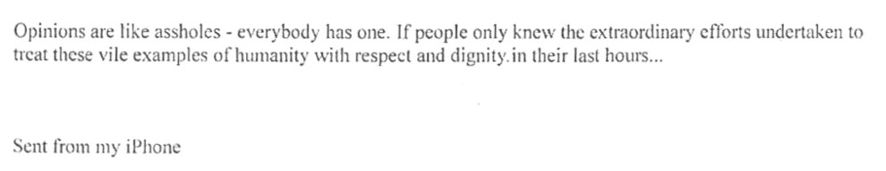 “Opinions are like assholes - everybody has one,” Hood responded. “If people only knew the extraordinary efforts undertaken to treat these vile examples of humanity with respect and dignity in their last hours…”