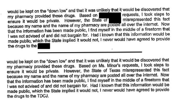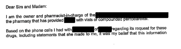 The Woodlands letter was actually sent to the Texas Department of Criminal Justice; an unredacted version of the letter was filed in federal court in Arizona in a lawsuit challenging that state’s execution protocol. In that letter, Woodlands asks Texas to return pentobarbital that it sent, saying it had believed their relationship “would be kept on the ‘down low.’”