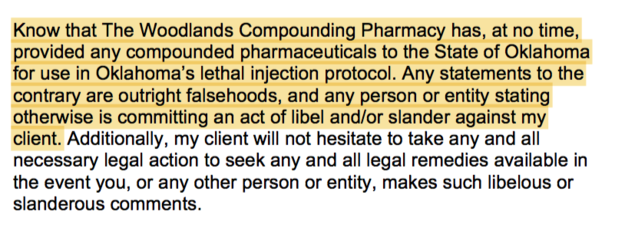 In fact, a lawyer representing the Woodlands Compounding Pharmacy said that stating Woodlands supplied execution drugs to Oklahoma would be “an act of libel and/or slander.”