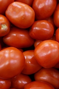 Plum tomatoes (left) are most common for tomato sauce. They have more flesh and fewer seeds, making for a thicker sauce.