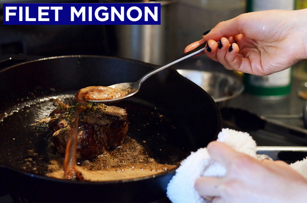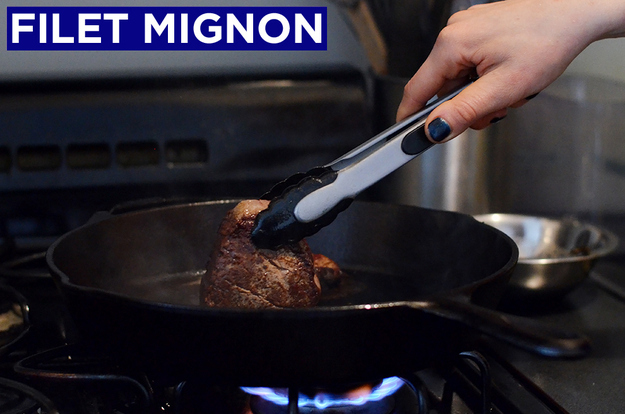 Note: Often, a filet mignon from the butcher comes tied with string to help it keep its shape while cooking. Cook the filet with the string on, then cut the string off before slicing.