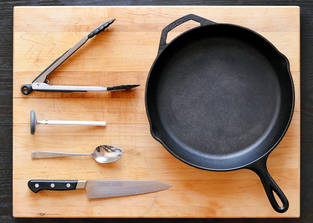 10. …plus a 12-inch cast iron skillet*, tongs, a meat thermometer**, a spoon, a cutting board, and a very sharp chef’s knife.