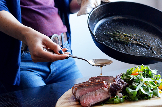 19. Get it ripping hot before you even think about putting the steak in. Your pan is hot enough when the oil starts to just barely smoke. Use tongs to place your steak(s) in the pan, working away from yourself.