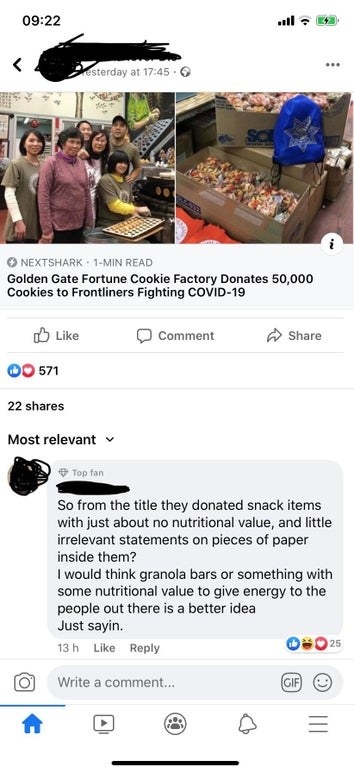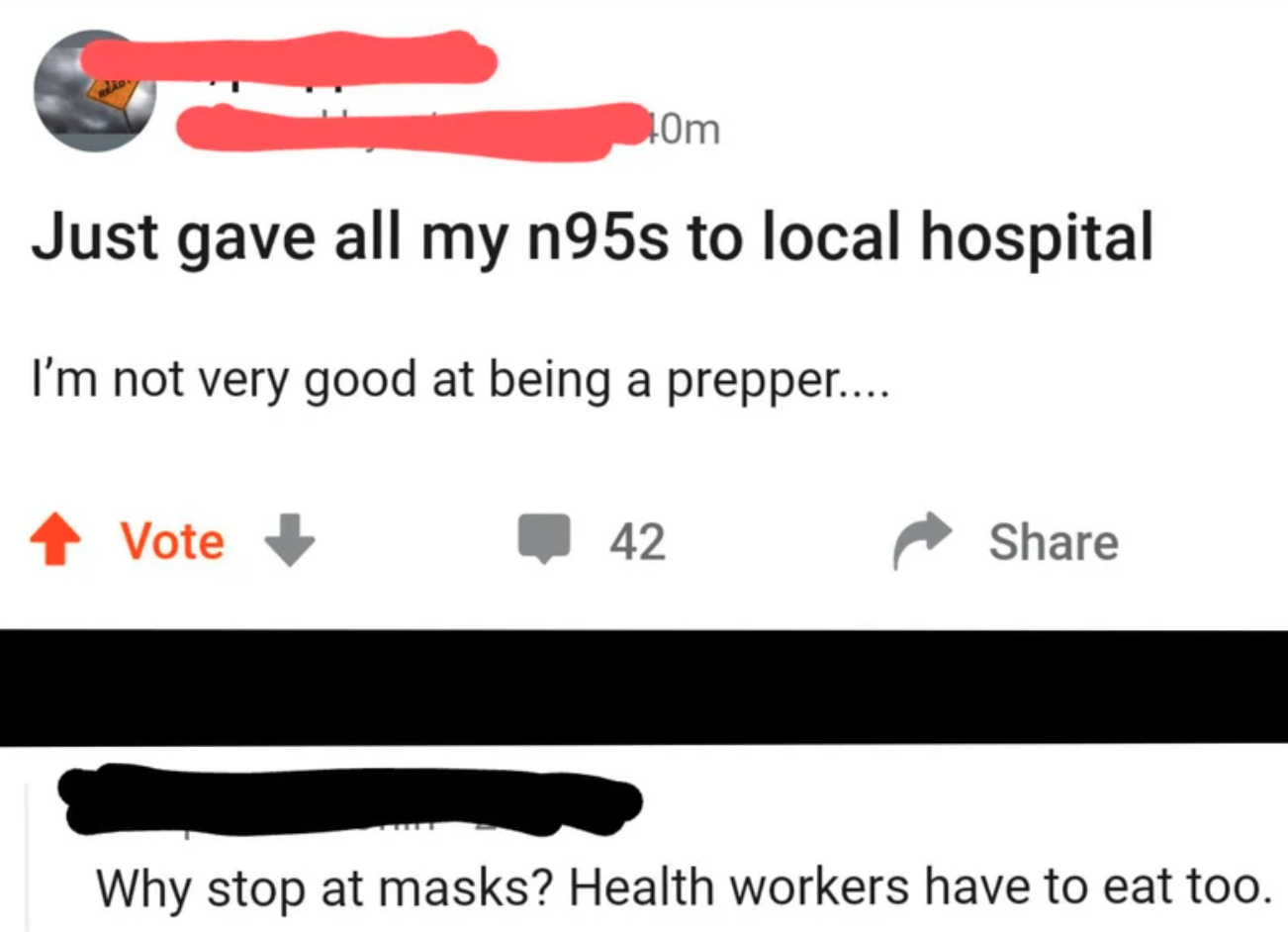 This person who gave their masks to the hospital and got criticized for not including food in the equation.