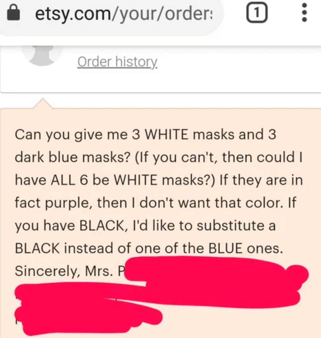 This person who is requesting random, color-specific masks from someone who is making FREE masks for healthcare workers.