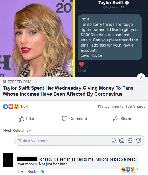 This criticism of Taylor Swift for donating to her fans.
