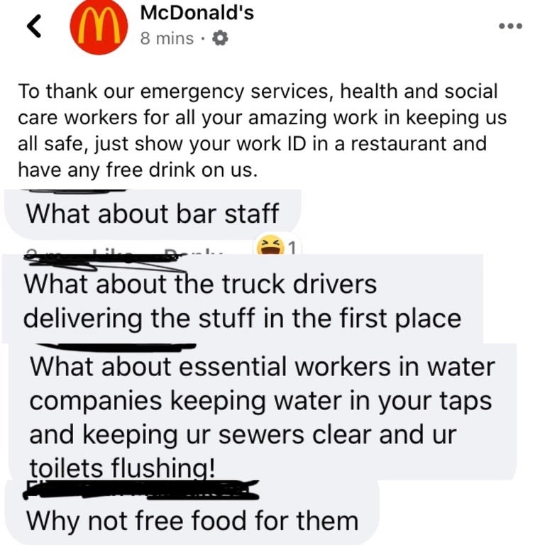 And finally, all of these people reacting to McDonald's offering free drinks to healthcare workers, proving that you truly can't please everyone.