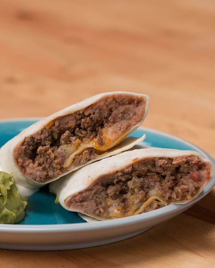 2. Assemble the burritos by microwaving the flour tortilla for 20 seconds, and begin to layer burrito starting with refried beans, followed by the cooked beef and cheese.