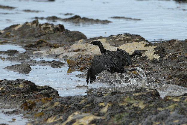 A bird covered in oil flaps its wings at Refugio State Beach on Thursday. Jae C. Hong / AP