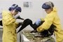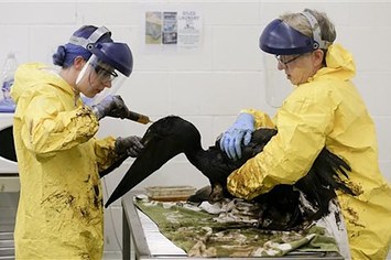Crews work to clean oil off a brown pelican on Friday. Chris Carlson / AP