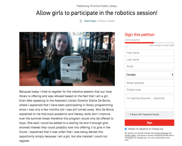 4. So Cayen launched a petition to require the library to let her and other girls register for the session.