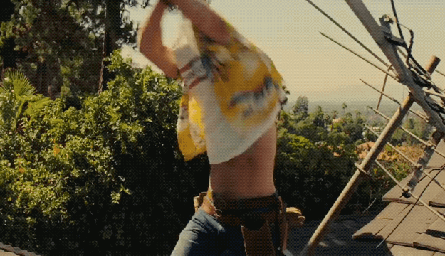 For context (*mild spoilers*), Brad hops up on Leo's roof to fix his antenna and, because of the ~hot~ SoCal sun, he pulls off his shirts. Still shirtless, he takes a moment to listen to music coming from the neighbor's house (the Tates), and then makes us all wish we still had antennas that could be broken and need fixing.