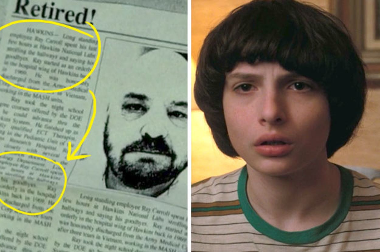 17.The retirement article about Ray Carroll (the Hawkins Lab orderly from El's flashbacks) on Kali's hit list wall repeats over and over.