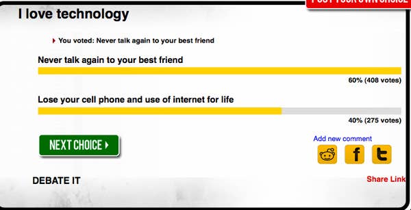 I love technology, much more than you, you see! See what else people are willing to give up on at http://www.terriblechoices.com