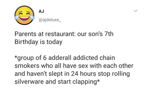 I love pulling this joke. Whenever a BOH coworker comes in a date to dine. Keep bringing them plates of edible bullshit. Chef to table style. Let it pile up in front of them until they have at least 6 plates of miso mayo and peanuts. Every plate must look good but make 0 sense. Explain nothing. from KitchenConfidential