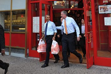 Obama and then–mayoral-candidate Bill de Blasio at Juniors Restaurant in Brooklyn in 2013. Mandel Ngan / Getty Images
