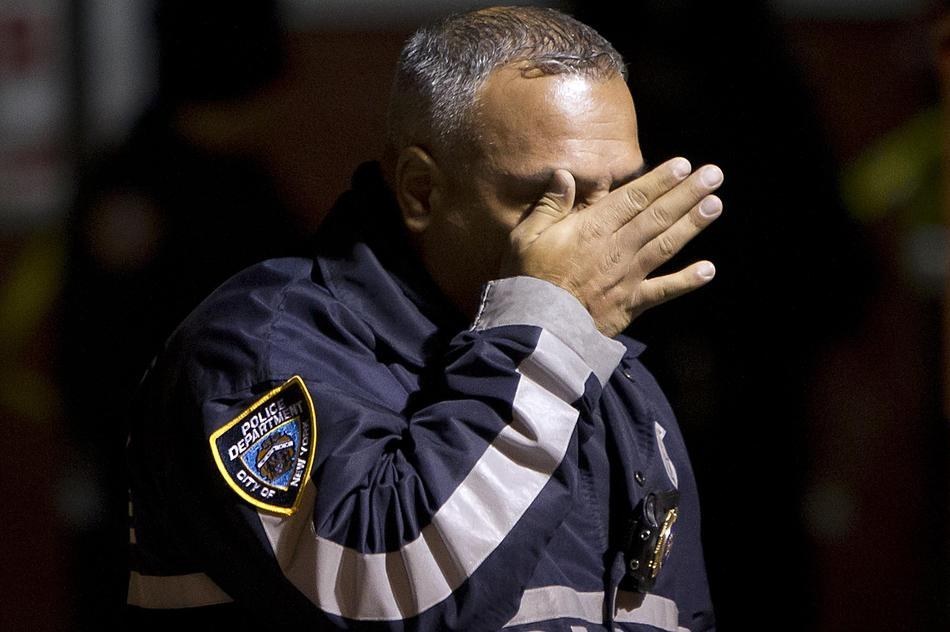 A police officer wipes tears from his face as he walks away from the scene the shooting Saturday. Carlo Allegri / Reuters