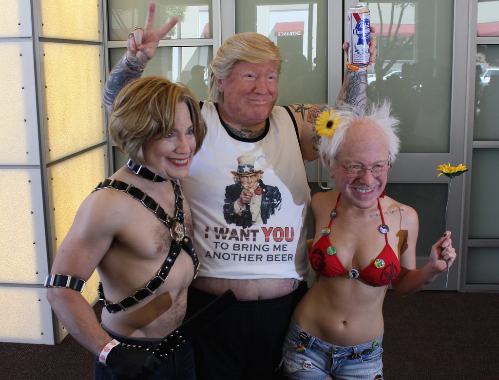 Meier enlisted the help of his girlfriend, Ashley Teasdale, and wrestler friend Bo Cooper to play Bernie and Trump, while he suited up as Hillary.