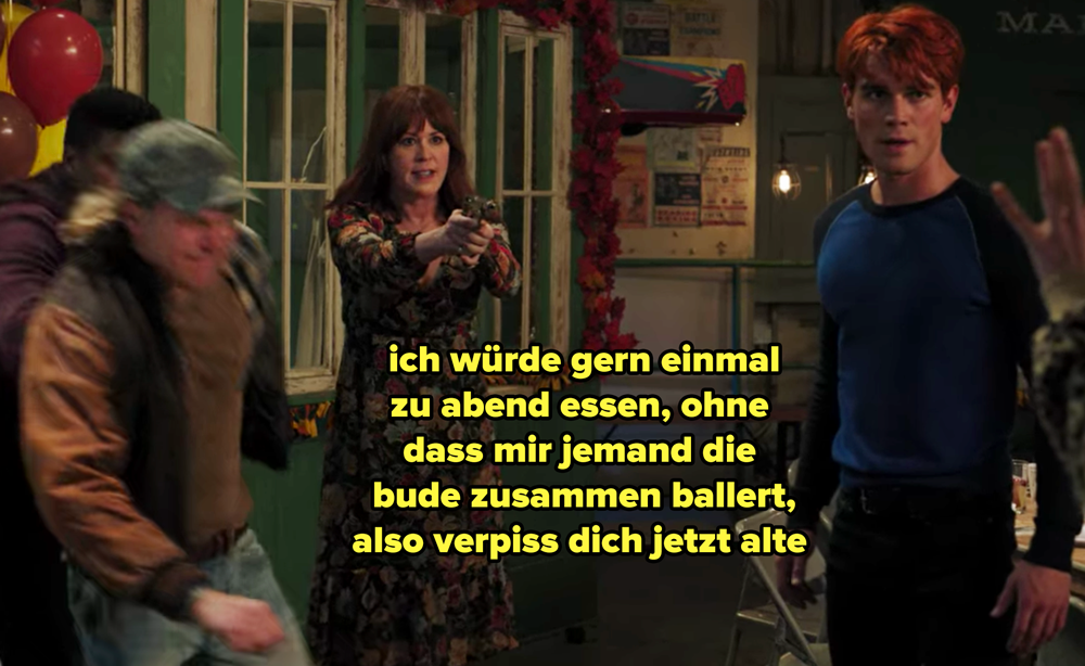 19. Okay, zurück zum Plot. Darla hat ihre Knarre auf Archie gerichtet, was in dieser Serie eher einem Händeschütteln gleicht. Ein Glück wollte dieser Idiot drinnen einen ganzen Truthahn frittieren, weshalb die Friteuse explodiert. Das sorgt für Ablenkung und Badass Mary Andrews rettet alle.