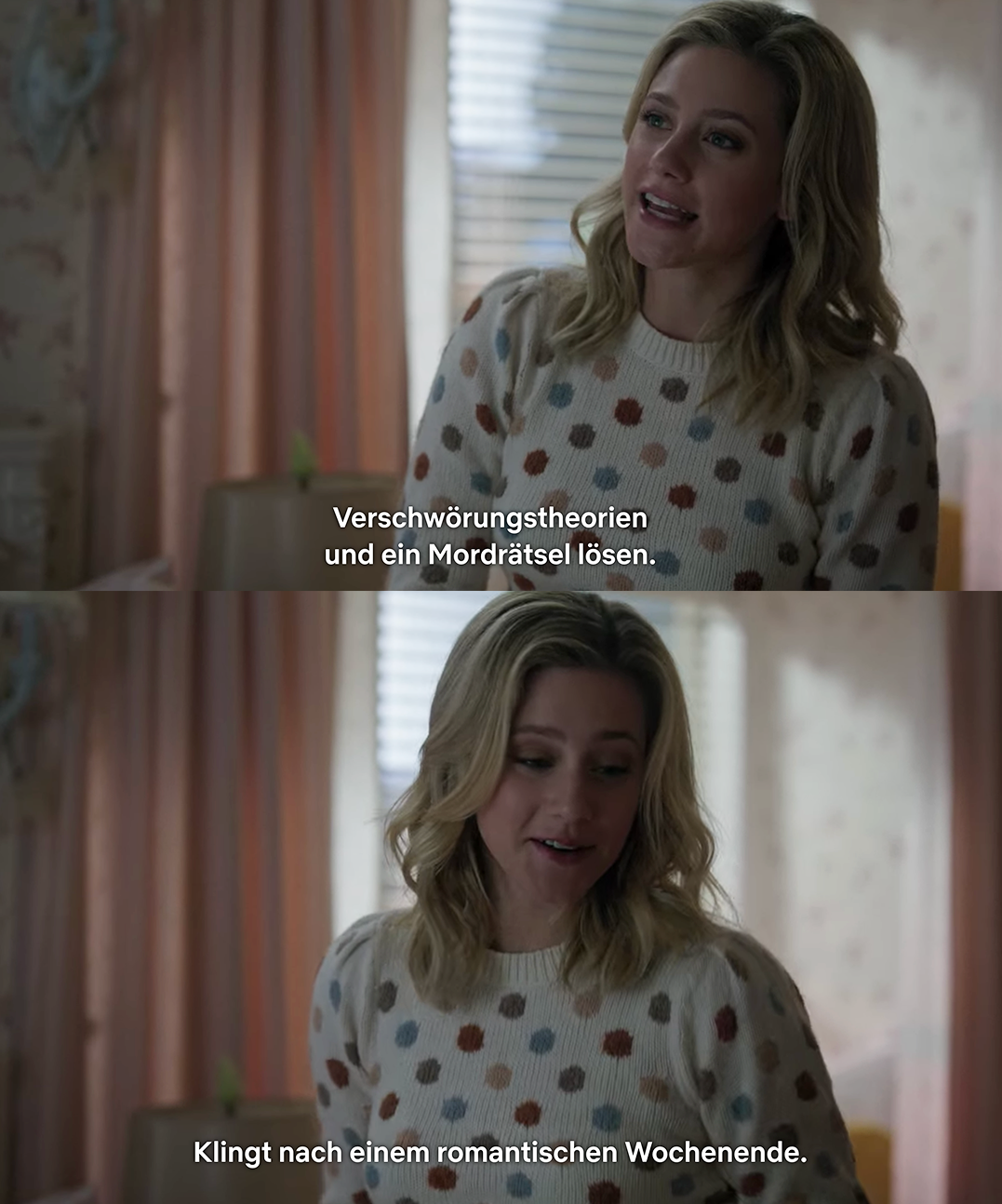25. Donna geht mit ihrer Story am nächsten Tag zur Schulleitung, womit das Thema Mr. Chipping fürs erste erledigt ist, weil jetzt erst recht alle denken, er habe Selbstmord begangen. Ich möchte darauf hinweisen, dass Jughead Holmes und Dr. Cooper noch ein bisschen Detektivnachhilfe brauchen, wenn sie nicht mal diese offensichtlich versteckte Kamera in Jugs Zimmer entdecken.