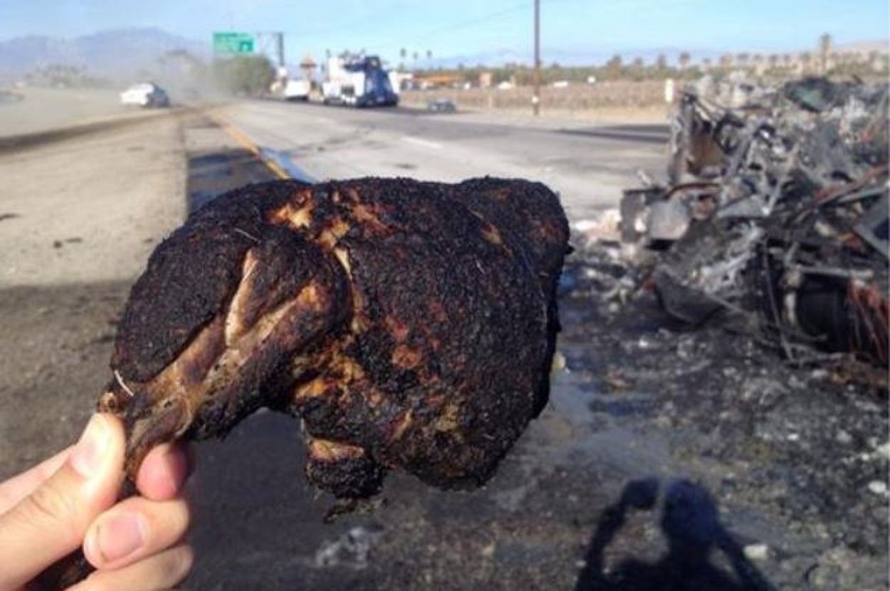 Two trucks crashed along a stretch of highway near the town of Coachella in California on Monday, and in the resulting fire, frozen chicken was barbecued.