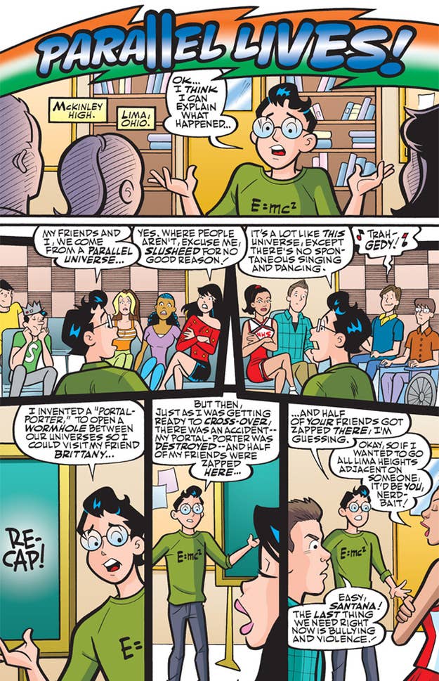 When teenage caricatures collide, things get weird. Buzzfeed go an exclusive look at the newest issue. Thanks to Dilton's science experiment gone awry, half the Glee cast is trapped in comic book form until he can unscramble the universes.