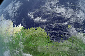 Above is Kevin Gill's assessment of how the western hemisphere of Mars would look either terraformed by human hands or returned to its ancient state. You can see Olympus Mons off to the left, the volcano three times the height of Everest reaching towards the sky. The open maw of the Valles Marineris canyons dominate the center of the concept art.