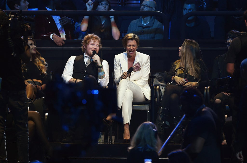 38. At the end of the night, while the credits were rolling on the screen, Ed Sheeran and Ruby Rose were sitting on the couch in their living room set while Ed threw props into the audience.