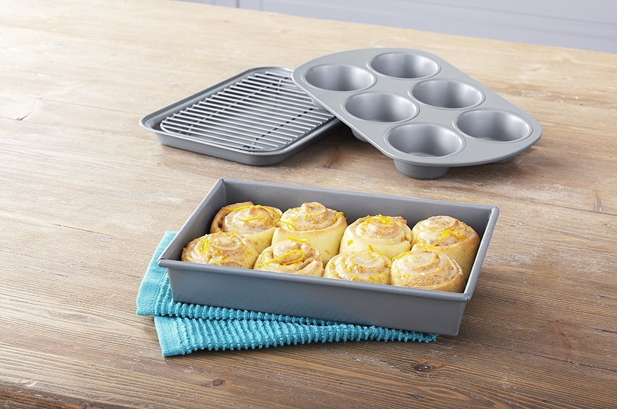 5. 29% off this four-piece nonstick bakeware set that fits perfectly in your toaster oven so you can heat up cinnamon rolls without heating up your whole kitchen.