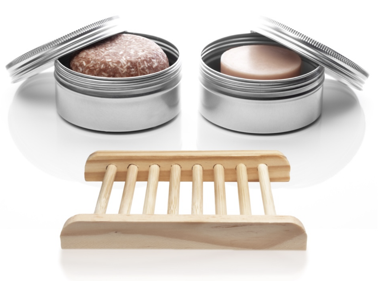 You can even treat yourself to the complete gift set which includes a shampoo bar, a conditioner bar, two travel tins, and a hemu wooden rack to place the wet bars so they can dry.