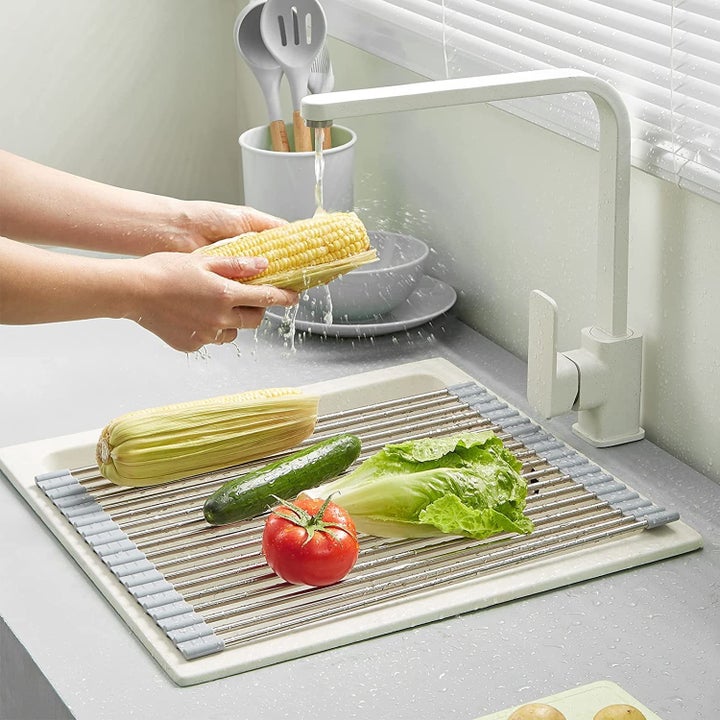 11. If you don't have much kitchen space this dish drying rack can be rolled up to save on storage, and can also be used as an over-the-sink drainer, or a trivet for hot pans.