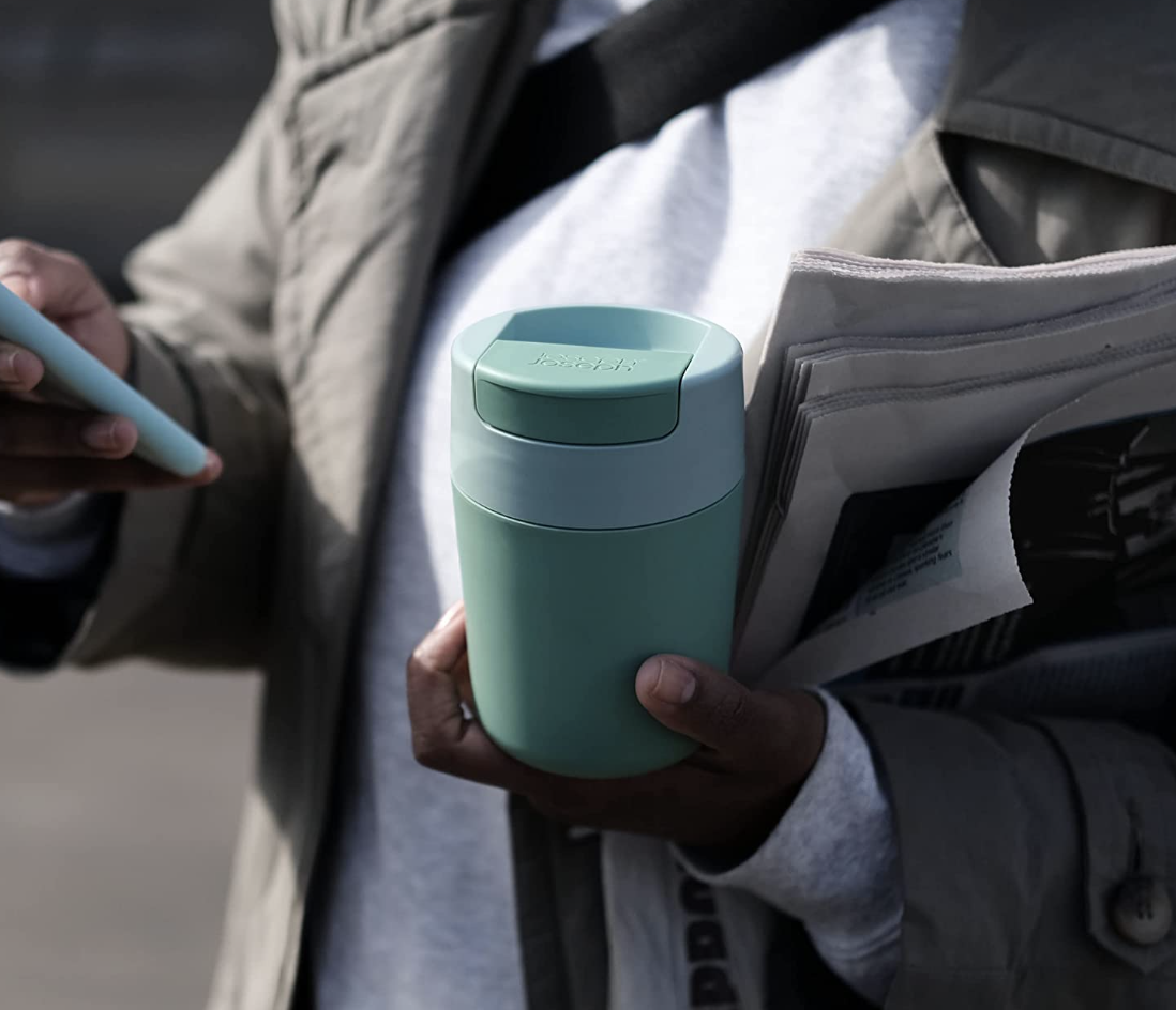 5. And if you like your coffee on-the-go, check out this Joseph Joseph travel mug. It has a flip-top lid for hygiene purposes and is leakproof.