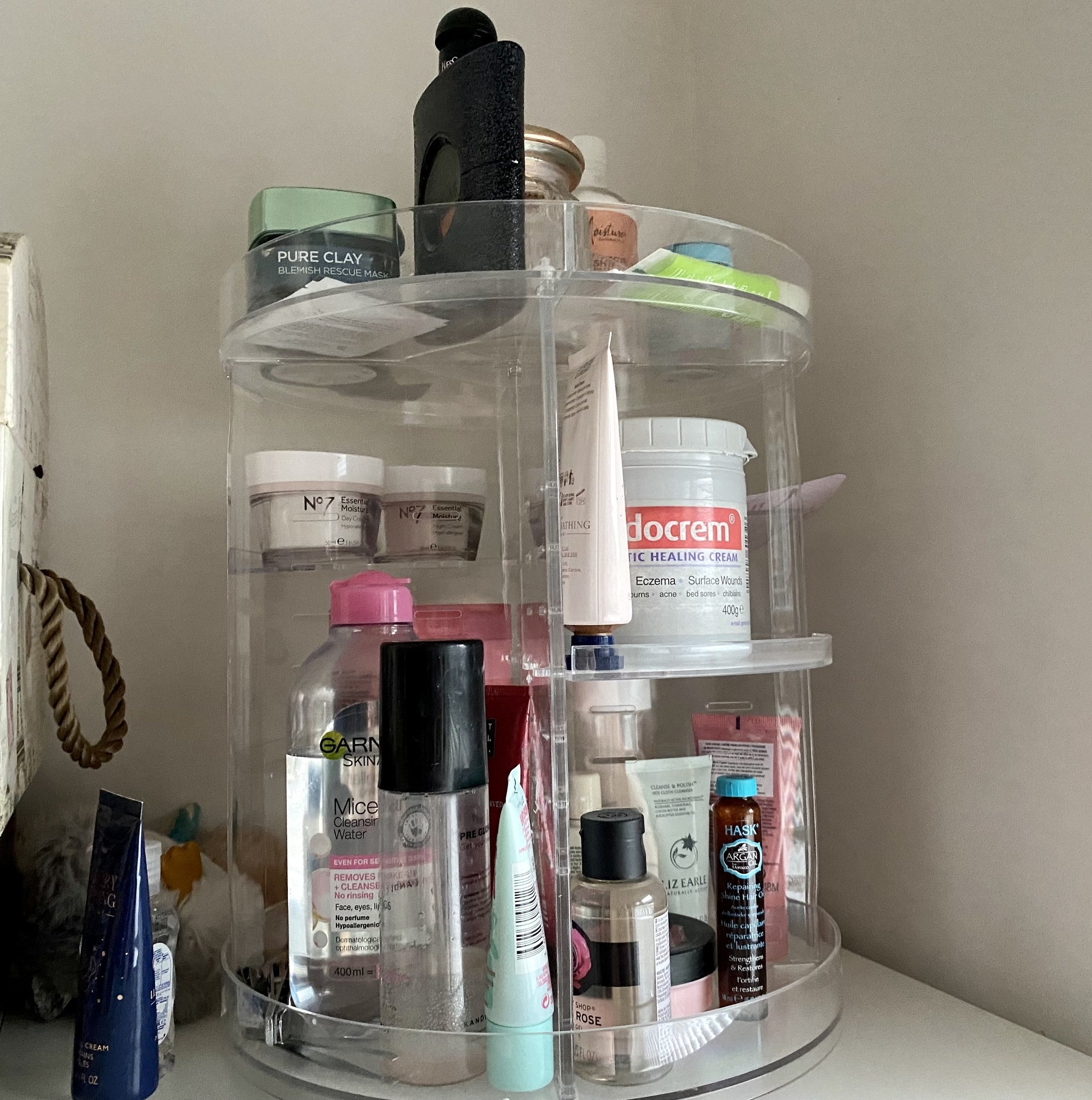12. This rotating cosmetics organiser keeps everything in reach so you can quickly grab whatever product you need! You can even adjust the height of the shelves for those annoyingly tall products.