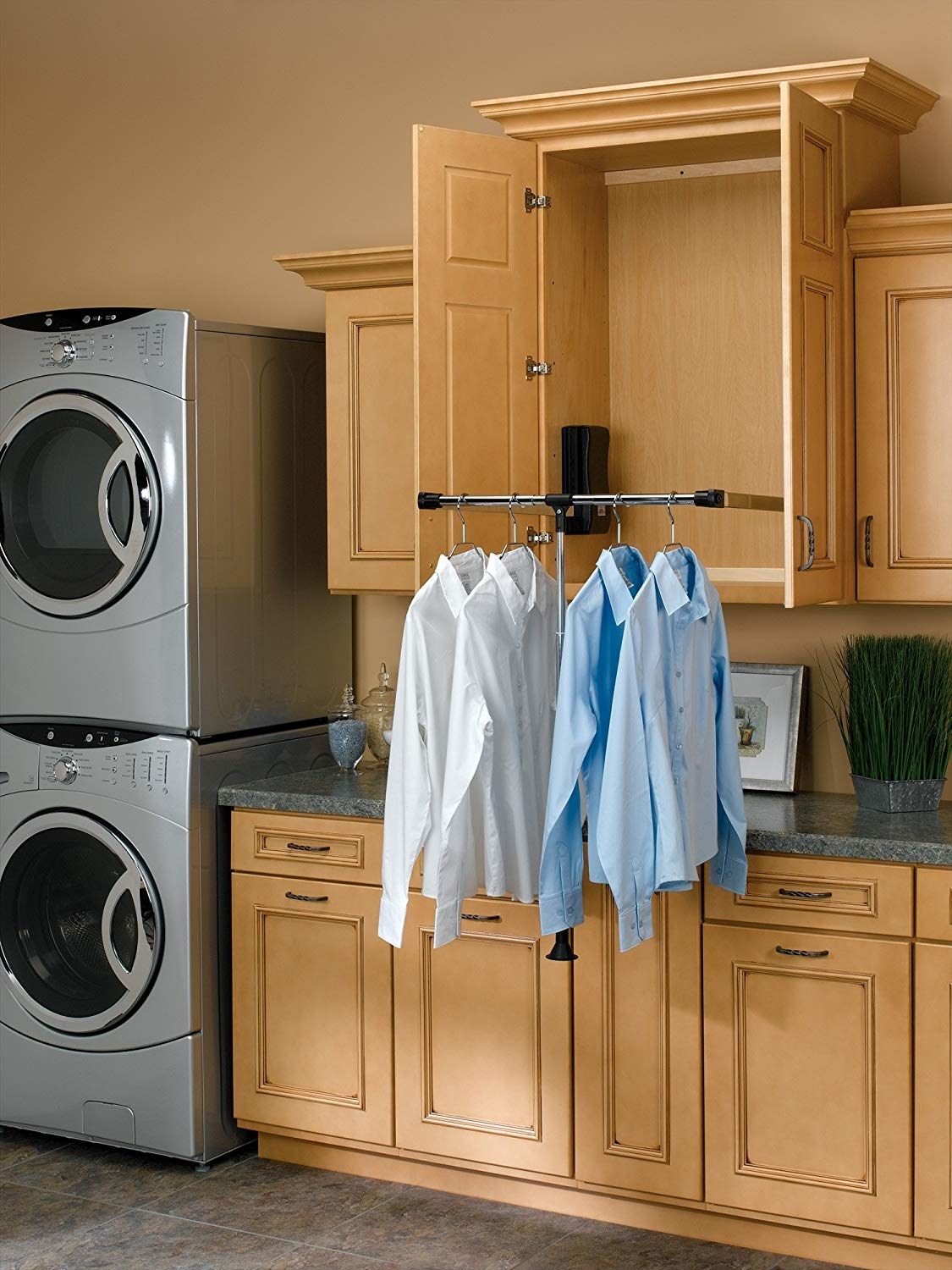 18. A pull-down closet rod — it can help you ~safely~ make full use of that upper cabinet in your laundry room. And it'll be incredibly useful for folks with limited mobility!