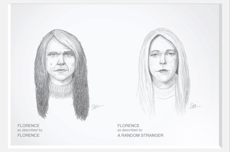 In every example, the women drawn from self-descriptions are uglier than those drawn from a stranger's description.