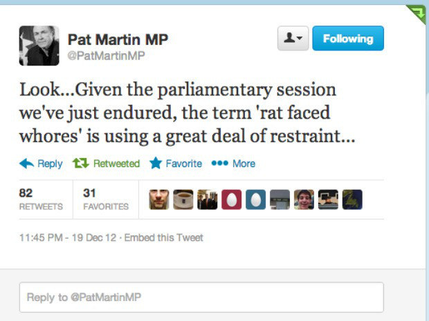 In 2012, Martin deleted his Twitter account after calling the Conservatives "rat faced whores" during a tirade.