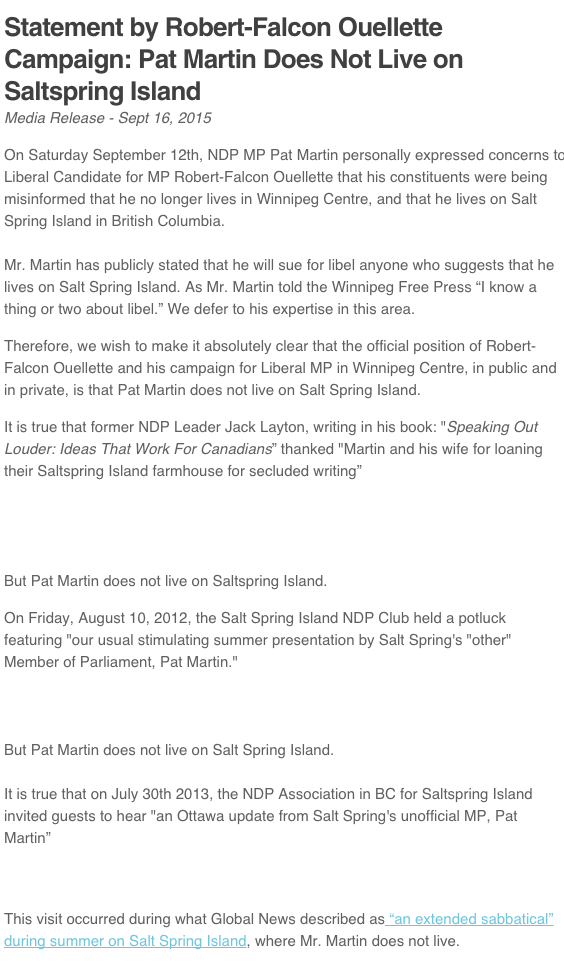 Even before the 2011 federal election Martin's political opponents had been floating the rumour that he really lives in Saltspring Island, British Columbia. Martin does have property on the island, but has threatened to sue anyone who says he doesn't really live in Winnipeg.