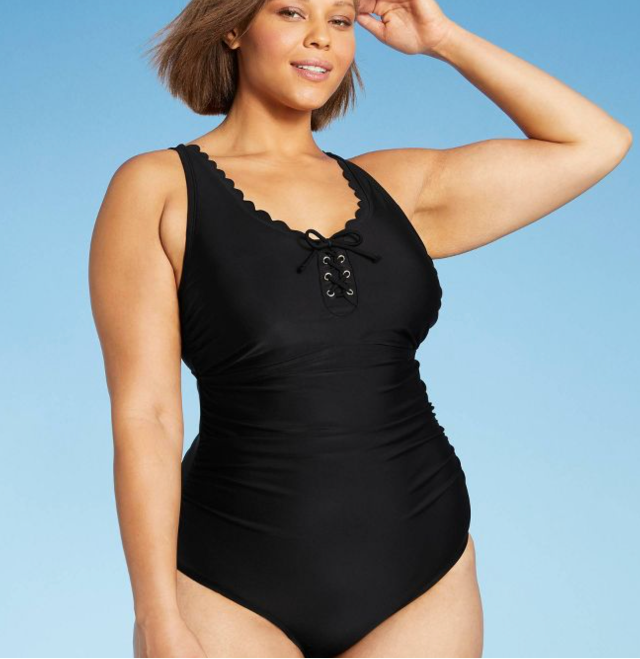 23. A sweet scalloped one-piece swimsuit with a little tie at the bust *plus* fully adjustable straps so you'll be fully supported if you take a break from Being Cute In A Swimsuit to Crush Everyone At Frisbee In A Swimsuit.