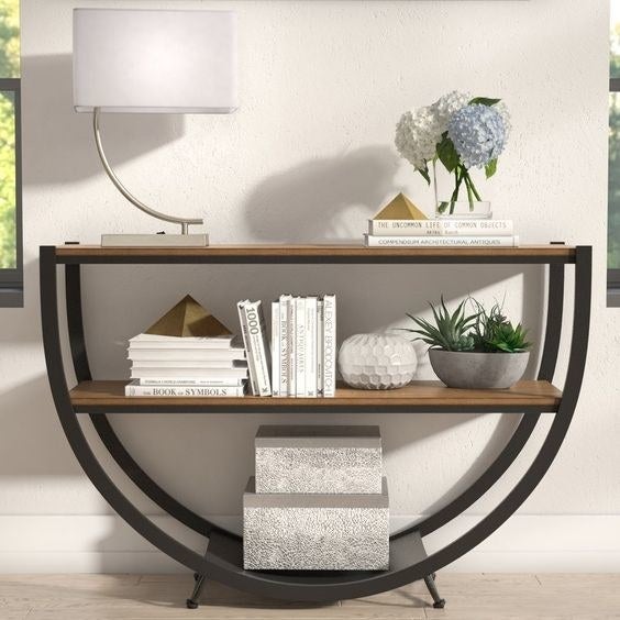 28. A modern console table with a sturdy metal base and two-tier shelving for creating a striking entry way without cutting your budget in half.