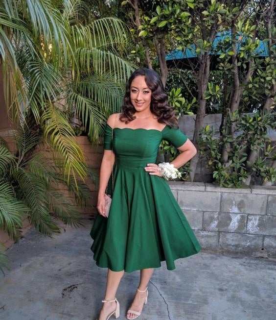 16. A scalloped off-the-shoulder dress, because this'll keep you cool during your AGGRESSIVE dance-off with the bride's grandma. This is why we can't take you anywhere.